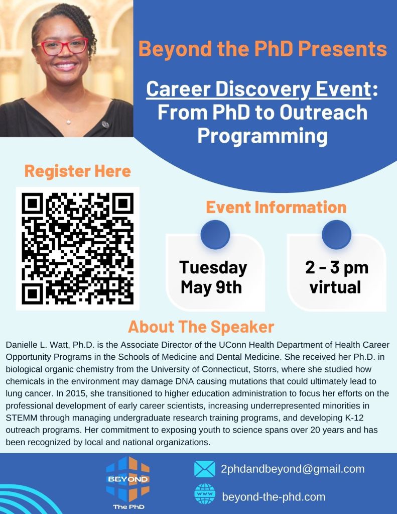 On May 9th Beyond the PhD will feature Dr. Danielle Watt. Danielle L. Watt, Ph.D. is the Associate Director of the UConn Health Department of Health Career Opportunity Programs in the Schools of Medicine and Dental Medicine. She received her Ph.D. in biological organic chemistry from the University of Connecticut, Storrs, where she studied how chemicals in the environment may damage DNA causing mutations that could ultimately lead to lung cancer. After completing a postdoc in DNA replication and repair at the NIEHS, NIH, she spent two years conducting DNA replication research at Umeå University, Sweden. In 2015, she transitioned to higher education administration to focus her efforts on the professional development of early career scientists, increasing underrepresented minorities in STEMM through managing undergraduate research training programs, and developing K-12 outreach programs. Her commitment to exposing youth to science spans over 20 years and has been recognized by local and national organizations, including the NOBCChE Dr. Henry McBay Outstanding Educator Award and the NIH Merit Award.